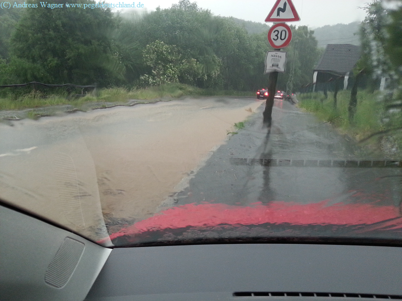 Abb. 4 Straßen sind nur noch halbseitig, schlimmsten Falls gar nicht mehr passierbar. Große Aquaplaninggefahr herrscht zudem, Gullys und Straßengräben sind geflutet - große Unfallgefahr, da man bei befahren der Überschwemmungszone von der Straße abkommen kann oder in ausgespülte Kanaldeckel einbrechen kann.